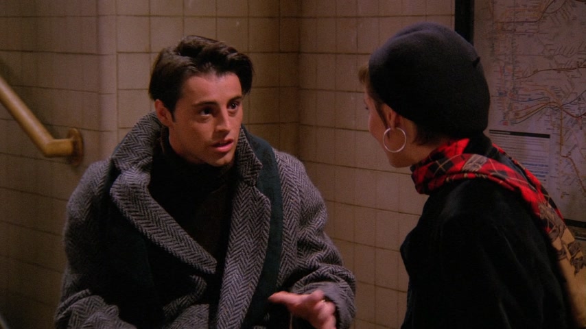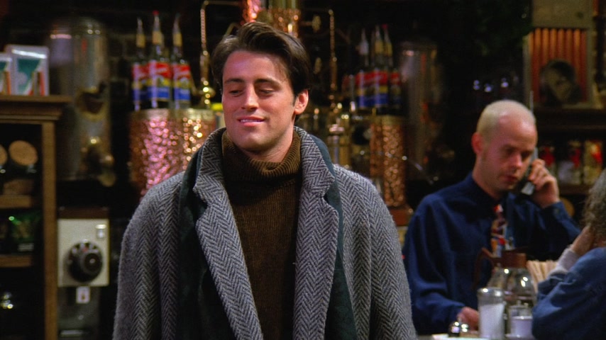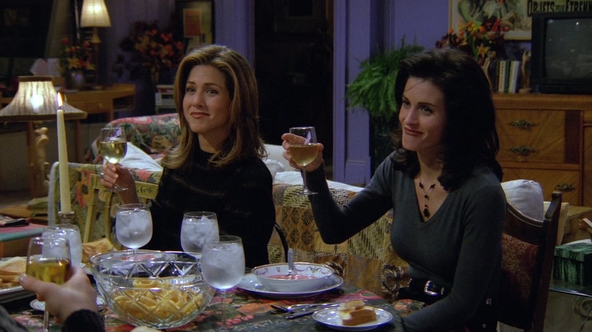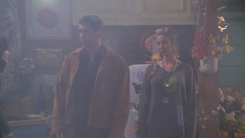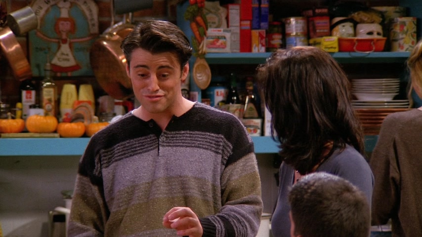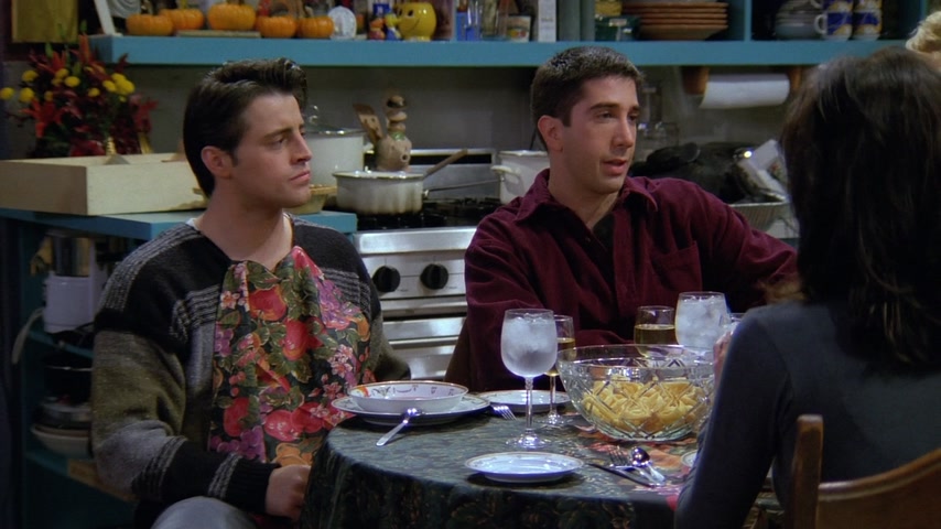 Рэйчел пытается выпросить у начальника 100 $ авансом для того, чтобы отправиться с родными в горы на День благодарения. Тот вынужден сказать ей, что она ужасная официантка, это подтвердили и все присутствующие в кафе. В кофейню к ребятам приходит Моника и сообщает Россу, что их родители улетают в Пуэрто-Рико на праздники и следовательно, семейный ужин отменяется. Заходит Джоуи с макияжем — он модель для рекламы в бесплатных медицинских учреждениях, однако, он еще не знает, «какая болезнь ему достанется». Моника предлагает Россу самой организовать праздничный ужин, тот просит сделать пюре с комочками, «как мама делает». Ребята делятся планами на праздники: Джоуи собирается к родителям, Фиби обычно отмечает с бабушкой, но так как любовник бабушки будет отмечать праздники только в декабре (по лунному календарю), то Фиби останется у Моники, Рэйчел все ещё собирается в Вейл (Колорадо) на лыжи. Росс приходит к Кэрол домой, но его встречает Сьюзан (Кэрол на собрании). Они пытаются побеседовать, но из-за взаимной неприязни ничего не выходит. Вдруг он замечает детскую книгу про Черепашку Ёртла, оказывается Сьюзан читает её неродившемуся малышу. Росс смеётся над этим, но в квартире у Моники рассказывает друзьям о своих переживаниях, что ребенок не будет его узнавать. Приходит расстроенная Рэйчел — она ничего не заработала для горнолыжного отдыха. Моника вручает ей конверт с деньгами для поездки, оказывается все ребята скинулись для Рэйчел. После чего Моника вручает Чендлеру пакет с традиционным для него «праздничным ужином»: томатный суп, жаренный сыр в тостах и луковые кольца. Чендлер ненавидит День благодарения, так как в этот день, когда ему было 9 лет, его родители объявили о разводе. Росс спорит с Фиби из-за батата. В метро Джоуи замечает симпатичную девушку, которая как и он когда-то рекламировала духи в Мэйси. Они флиртуют, но девушка замечает рекламный плакат с Джоуи, а на нем надпись «Что скрывает Марио? Венерические болезни. Ты никогда не знаешь у кого они есть». Оказывается подобные плакаты развешаны по всему городу и теперь семья Джоуи думает, что он на самом деле болен и не хочет видеть его на праздники. В квартире Моники идет подготовка к праздничному ужину: Моника и Фиби на кухне, Росс волнуется перед «разговором с малышом», Рейчел уже купила билеты на самолет, Чендлер отстранен от праздничной суматохи. Джоуи просит Монику приготовить картофельные шарики, как обычно делает его мама. Росс уходит к Кэрол. Фиби взбивает пюре миксером, Моника в шоке, ведь Росс просил с комочками. Фиби оправдывается, что хотела сделать так как её мама. Моника обещает сделать три вида картофеля для каждого: пюре с комочками для Росса, картофельные шарики для Джоуи и пюре с луком и горошком для Фиби. Рэйчел готова к вылету. В это время забегает Чендлер и сообщает, что большая надувная кукла Суперпса оторвалась от платформы на параде и пролетает над городом, он предлагает всем посмотреть на это. Все выбегают из квартиры. Росс пытается поговорить с малышом в животе Кэрол, но у него ничего не получается до тех пор, пока Кэрол не приводит в пример Сьюзен. Росс начинает петь песенку, а малыш отзывается первым пинком. Когда ребята возвращаются, то обнаруживают, что дверь в квартиру захлопнулась, а ведь там документы Рэйчел и включенная духовка с едой. Джоуи вспомина