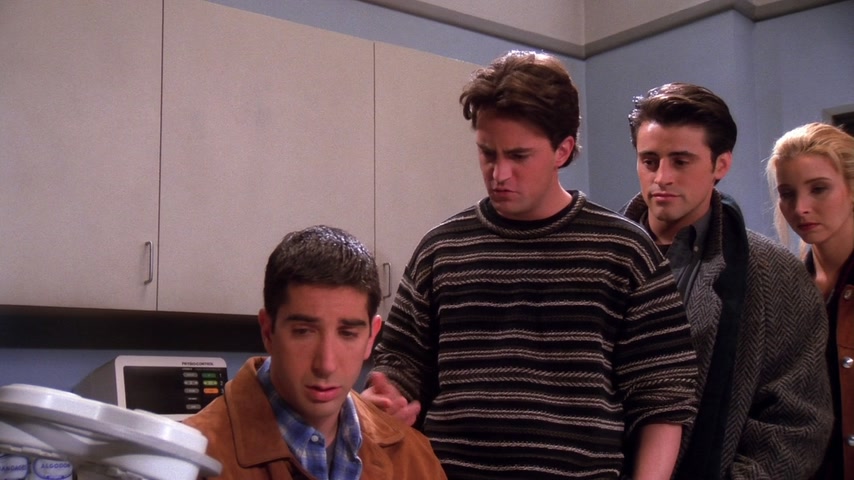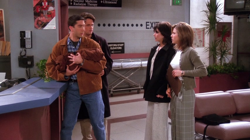 Моника приводит Рэйчел в больницу, похоже, что та растянула лодыжку. Девушки заполняют анкету и выясняется, что у Рэйчел нет медицинской страховки. Она просит Монику записать данные своей страховки. В палате Моника и Рэйчел знакомятся с красивыми докторами: Митчелом и Розеном, но им не сладко в общении, так как девушкам пришлось «поменяться личностями» из-за страховки. В кофейне Росс рассказывает парням свой сон: он играет в футбол, но вместо мяча — его будущий сын. Парни успокаивают Росса, утверждая, что он будет хорошим отцом. Джоуи хочет пригласить Урсулу в очень дорогой ресторан «Rainbow room» на её день рождения, Чендлер спрашивает, что на счёт Фиби, ведь у неё тоже день рождения (об этом Джоуи не подумал); он думает, что та должна его понять. Ребята устраивают вечеринку-сюрприз для Фиби. Они принимают Росса за именинницу, тот пугается и роняет именинный торт. Все рассматривают остатки от десерта и в это время заходит Фиби. Сюрприз не получился, но она все равно рада, однако расстраивается когда обнаруживает отсутствие Джоуи. Росс обедает со своим отцом в ресторане, он пытается понять, какого это быть отцом, и просит совета у своего. Тот рассказывает, что почувствовал себя отцом, когда Росс впервые схватил его за палец. Моника и Рэйчел ждут красивых докторов у себя в квартире: у них двойное свидание. Вечер идет наперекосяк, когда Моника хочет рассказать правду. Девушки начинают ссориться и высказывают своё мнение о недостатках друг друга, используя свои «фиктивные личности»: Моника начала с того, что сбежала из-под алтаря, затем, что она избалованная и в детстве писала в кровать, а Рэйчел с того, что ей нравится работать шеф-поваром, потому что можно покомандовать, что в школе она была очень толстой, и что она выставляет грудь, чтобы привлечь парней. Раздается спасительный для докторов телефонный звонок — это отец Рэйчел. Моника берет трубку и рассказывает, как она (т.е. Рэйчел) в школе спала с Билли Дрестоном пряма в родительской кровати. На следующий день девушкам звонят из регистратуры — в анкете ошибка. Рэйчел решает больше не мухлевать со страховкой. Они идут в больницу чтобы записать настоящие данные. Урсула динамит Джоуи, тот расстроен. Фиби решила поговорить с сестрой, она идет к ней на работу в кафе. В честь дня рождения, Фиби дарит сестре детский термос (такой же как тот, что она разбила в девстве), а Урсула дарит кофту, подаренную Джоуи. Урсула объясняет, что больше не хочет встречаться с Джоуи. Парни играют в эрудит, обсуждая отцовство Росса. Они обнаруживают, что Марсель проглотил одну из букв и мчатся в больницу. В той же больнице они встречают Монику и Рэйчел, но администратор не принимает животных, ведь это не ветеринария. Спасти питомца вызывается доктор Митчел. Фиби решает притвориться Урсулой и приглашает Джоуи в Центральную кофейню, чтобы расстаться. Джоуи в замешательстве, решает, что это из-за дружбы с Фиби, та соглашается с его теорией. На прощание Джоуи целует девушку и понимает, что это Фиби. Друзья мирятся. В больнице друзья переживают за Марселя. Чендлер утверждает, что Росс поступил очень по-отцовски — он спас своего подопечного. Марсель отходит от наркоза и хватает Росса за палец, тот радуется и приобретает уверенность. Все ребята в сборе в квартире Моники, они говорят по-испански и обсуждают уродливого голого мужика 