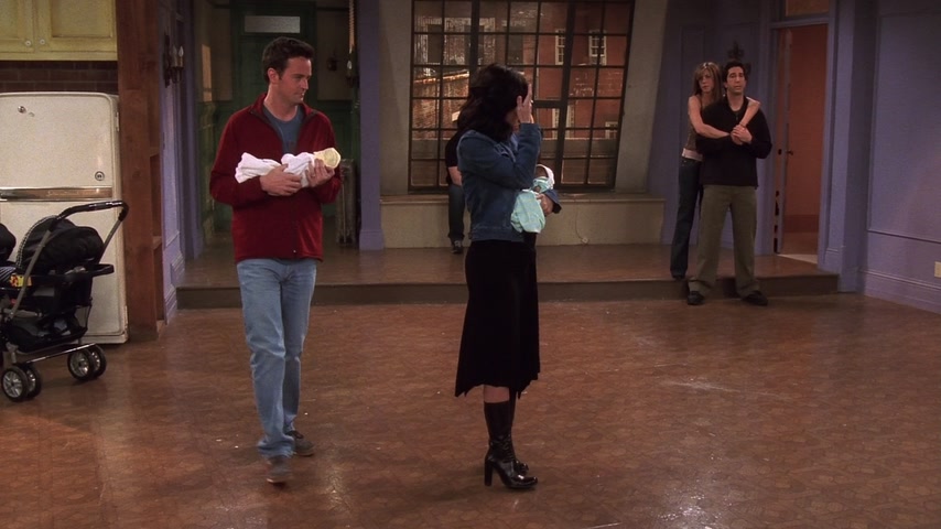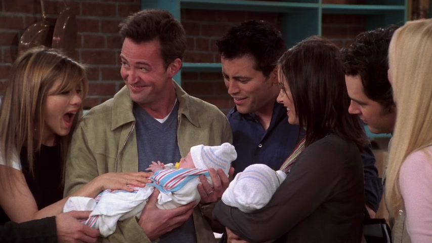 Часть 1 Моника и Чендлер находятся в госпитале вместе с Эрикой, готовящейся рожать ребёнка на три недели раньше. Моника уходит ненадолго, оставляя Эрику и Чендлера наедине, от чего Чендлер чувствует себя неуютно. Когда она возвращается, Эрика начинает рожать мальчика (которого позже называют Джеком в честь отца Моники). Только Эрика успокаивается после родов, доктор объявляет, что следующий ребёнок появится на свет через минуту. Шокированные Моника и Чендлер узнают, что Эрика должна родить близнецов, о чём ни они, ни сама Эрика не подозревали. Позже у Эрики рождается девочка, которую называют Эрикой (в честь биологической матери). Фиби приходит к Джоуи в его квартиру и видит маленьких цыплёнка и утёнка — подарок на новоселье Моники и Чендлера от Джоуи. Появляется Росс, узнаёт о родах Эрики, а потом рассказывает, что провёл ночь с Рэйчел. Рэйчел выходит из своей комнаты, и, в разговоре наедине с Россом говорит, что проведённая ночь — прекрасный способ попрощаться. В Центральной Кофейне Росс говорит Фиби и Джоуи о словах Рэйчел. Фиби предлагает Россу рассказать ей о своих чувствах, чтобы она не уехала в Париж. Росс соглашается, но Гантер опережает его и рассказывает Рэйчел, что любит её. Рэйчел говорит, что она будет думать о нём в Париже и целует его в щеку. Росс в квартире Моники говорит, что не собирается объясняться с Рэйчел, чтобы ему не отказали, как Гантеру. Джоуи и Майк приготовили приветственные плакаты для ребёнка. Рэйчел жалеет, что Моника и Чендлер не вернулись с ребёнком до её отъезда. Но тут входит Моника с мальчиком на руках. Все толпятся вокруг Моники, поздравляют её, когда Чендлер входит с девочкой. После ожидаемого замешательства Рэйчел объявляет, что должна ехать. Она напоследок прощается с Россом и уезжает в аэропорт. После её ухода Росс внезапно передумывает и решает последовать за Рэйчел аэропорт на такси Фиби с ней же за рулём. Часть 2 Джоуи возвращается в свою квартиру, чтобы забрать цыплёнка и утку, которых он спрятал, но не находит их. После поисков выясняется, что они застряли в настольном футболе. Чендлер и Джоуи решают сломать его чтоб вызволить птиц, так как у них никак не получается их достать по-другому. Опасное, но быстрое вождение Фиби доставляет её и Росса в аэропорт вовремя. Им приходится купить билет на самолёт, чтобы охрана пропустила их в зал ожидания вылета, они ищут номер рейса Рэйчел, для чего звонят Монике. Выясняется, что самолёт Рэйчел вылетает из аэропорта Ньюарк, тогда как они с Фиби в аэропорту имени Джона Кеннеди. Фиби звонит Рэйчел, которая уже села на самолёт, чтобы задержать её на время. Когда пассажир, сидящий рядом с Рэйчел, подслушивает их с Фиби разговор, где она выдумывает проблему с креплением «левого фюзеляжа», он поднимает панику, сходит с самолёта и побуждает к этому всех остальных. Чендлер и Джоуи, которые сильно привязаны к настольному футболу, не находят в себе силы сломать его и просят это сделать Монику, которая с радостью его ломает. После того, как они освобождают птиц, Чендлер предлагает Джоуи оставить их себе, обещая навещать их, и это будет лишним поводом им встретиться. Фиби и Росс успевают в соседний аэропорт, как раз в тот момент, когда снова началась посадка на рейс Рэйчел. Росс говорит ей, что любит её, но это не останавливает её, и она садится в самолёт. Росс возвращается дом